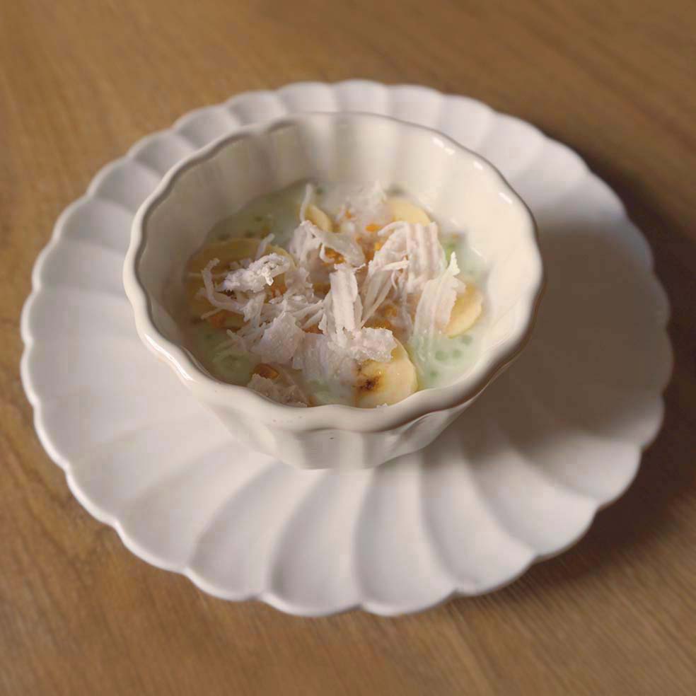 Dessert de banane avec lait de coco, cacahuète et tapioca