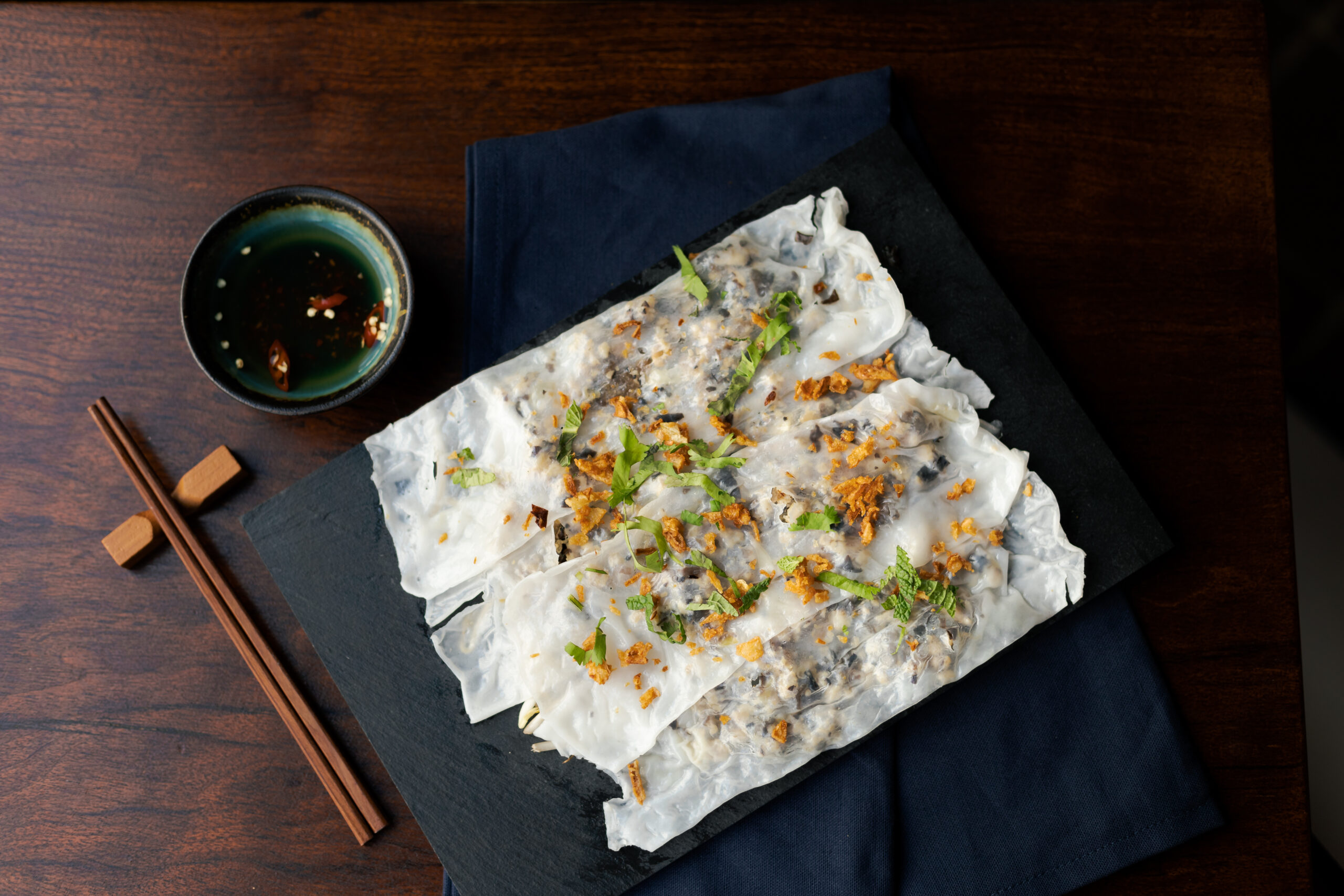 Crêpe vietnamien à la vapeur garnis porc haché et champignon parfumé, pousse de soja, oignon frit, coriandre - sauce unique à Dat Viet