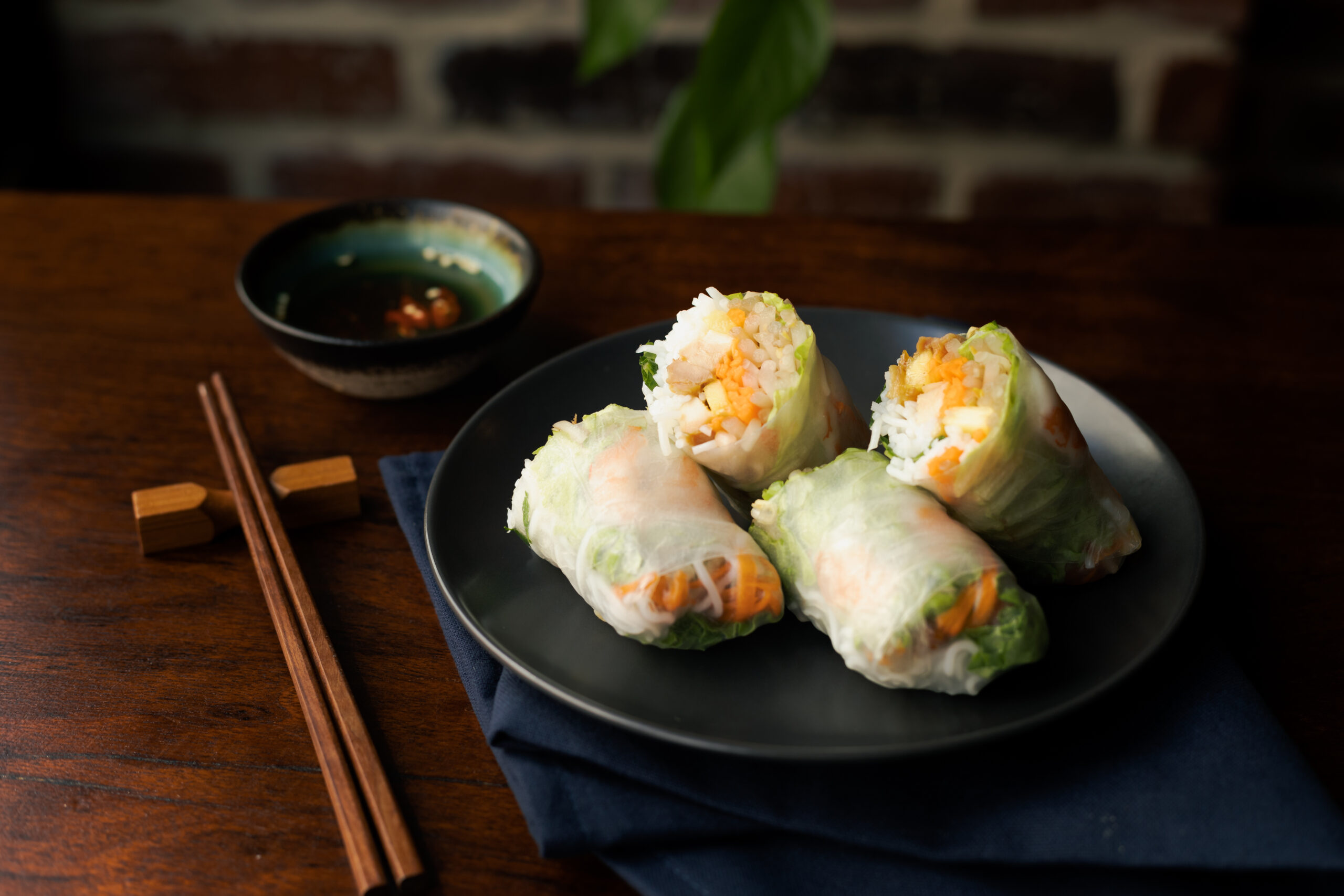 2 rouleaux de printemps avec poulet, crevette vermicelles de riz, menthe, salade verte