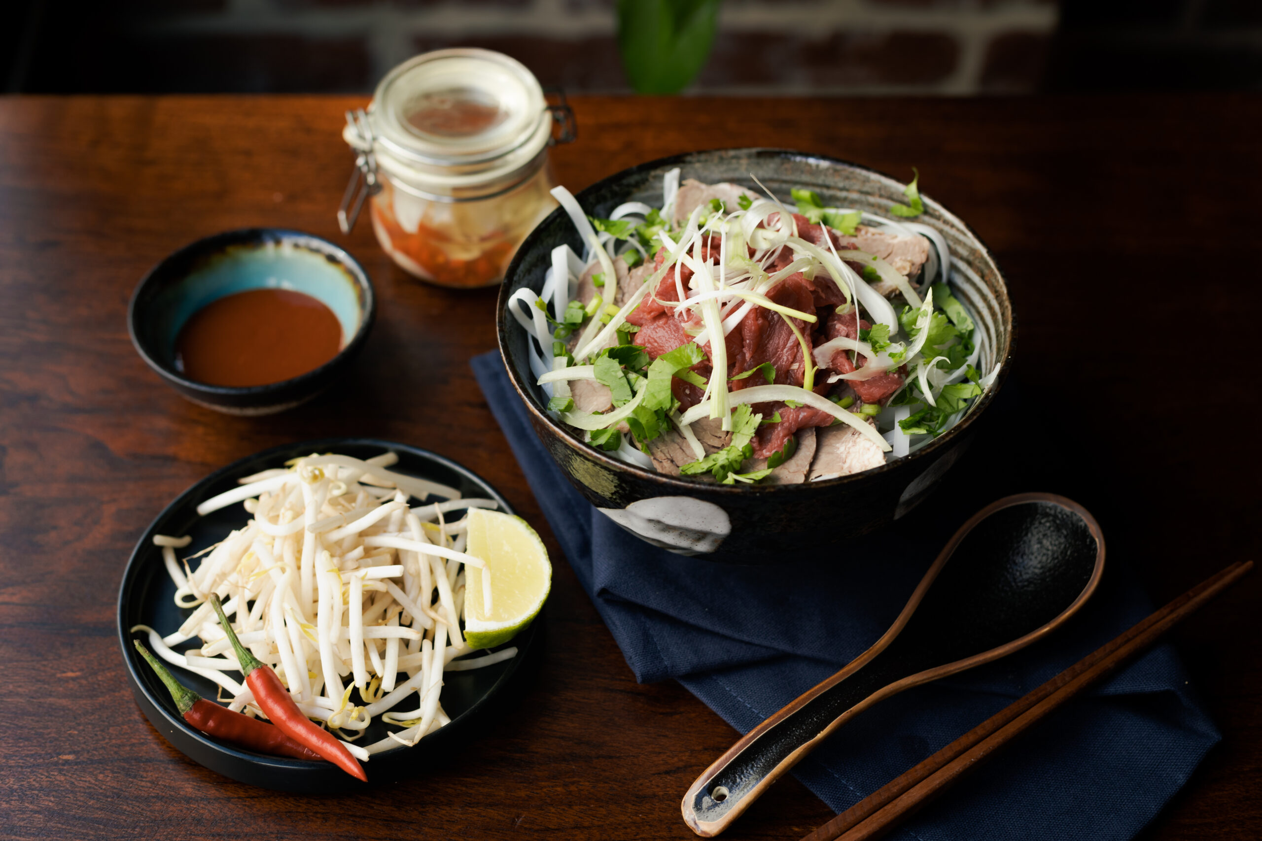 Soupe Pho traditionnel au boeuf avec pate de riz, tranche de boeuf cru et cuit, herbes asiatique
