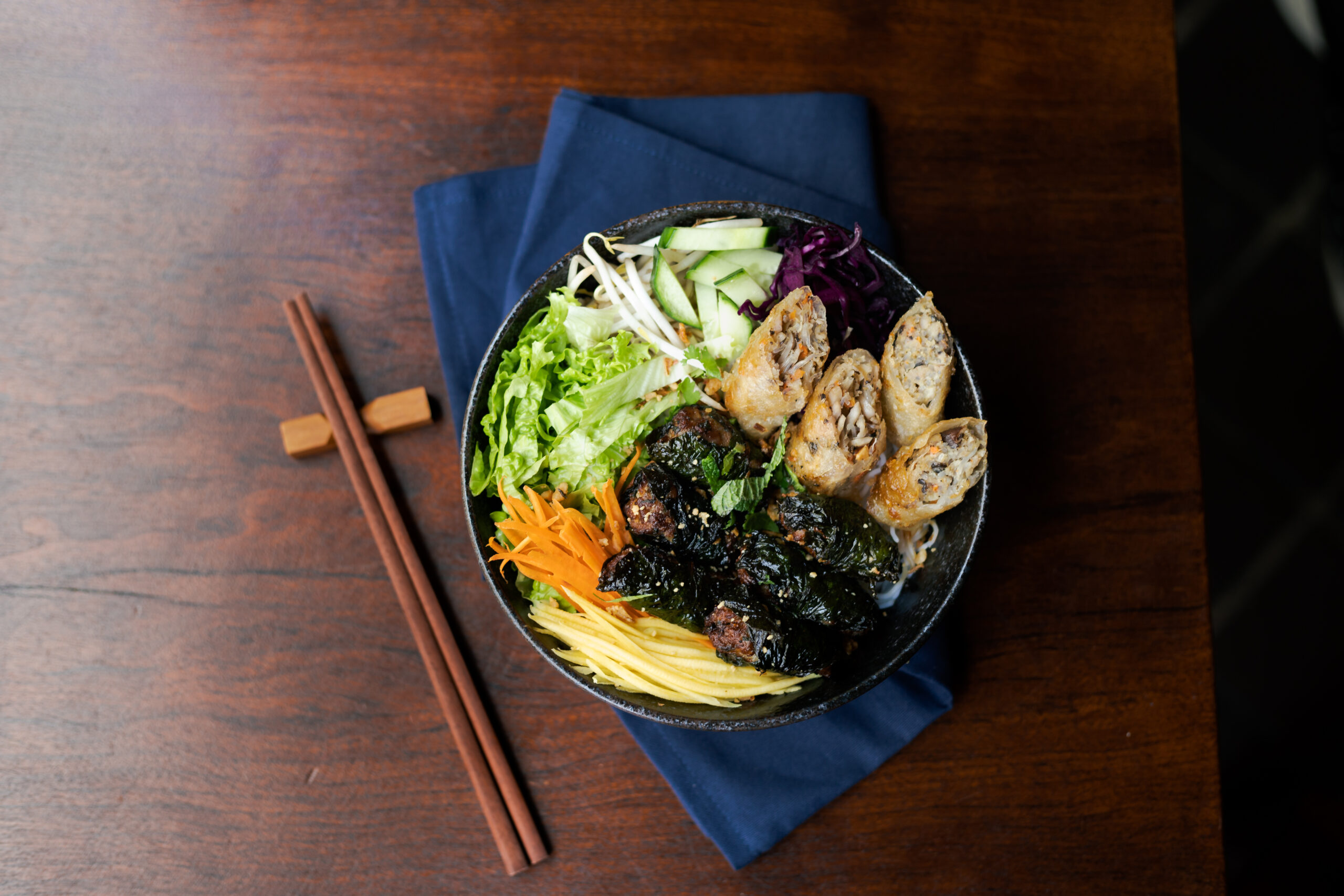 Vermicelles de riz, crudités, bœuf sauté, nem au porc / aux légumes, aux cacahuètes, oignon frits