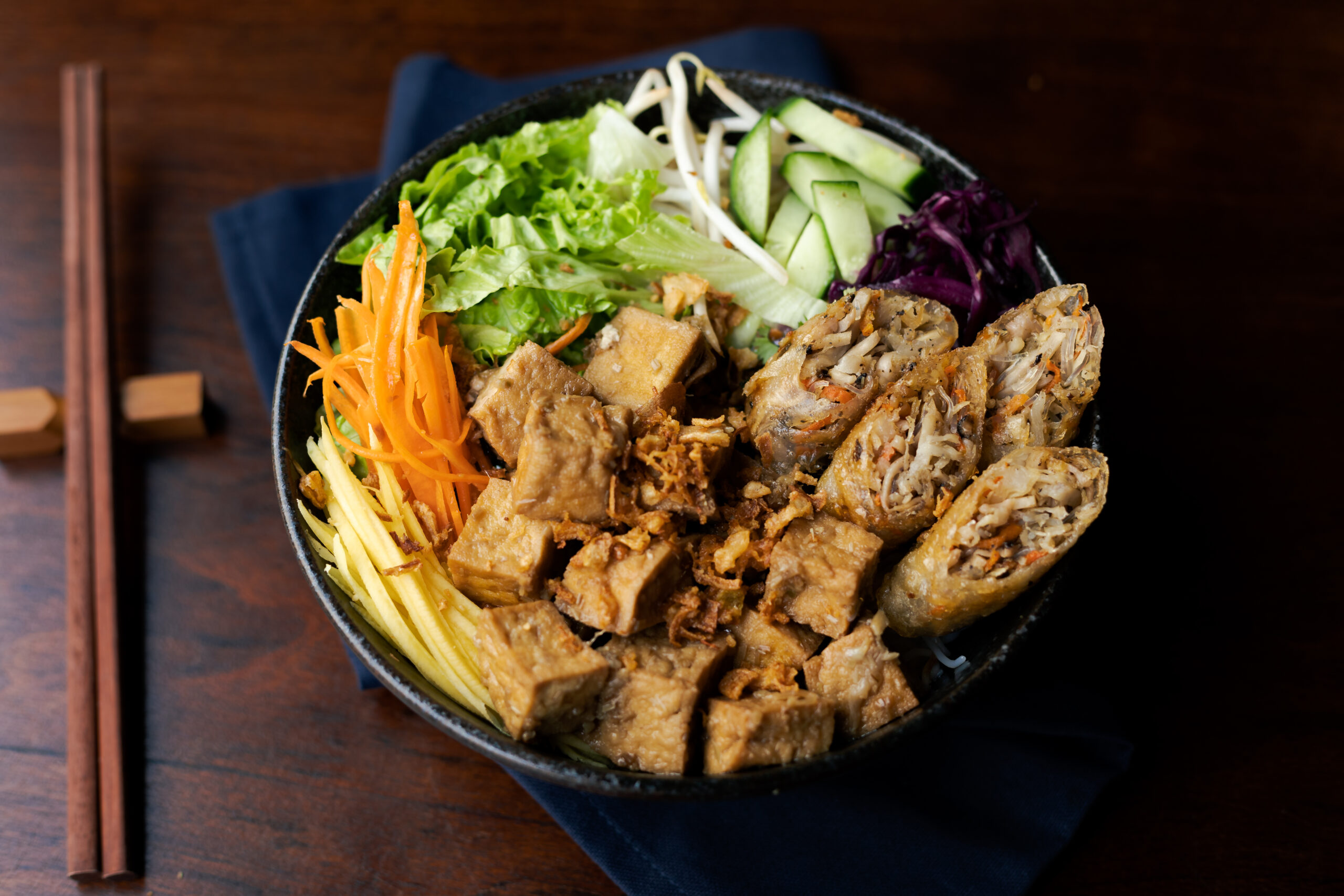 Vermicelles de riz. crudités, tofu sauté, nem aux légumes, cacahuètes, oignon frit