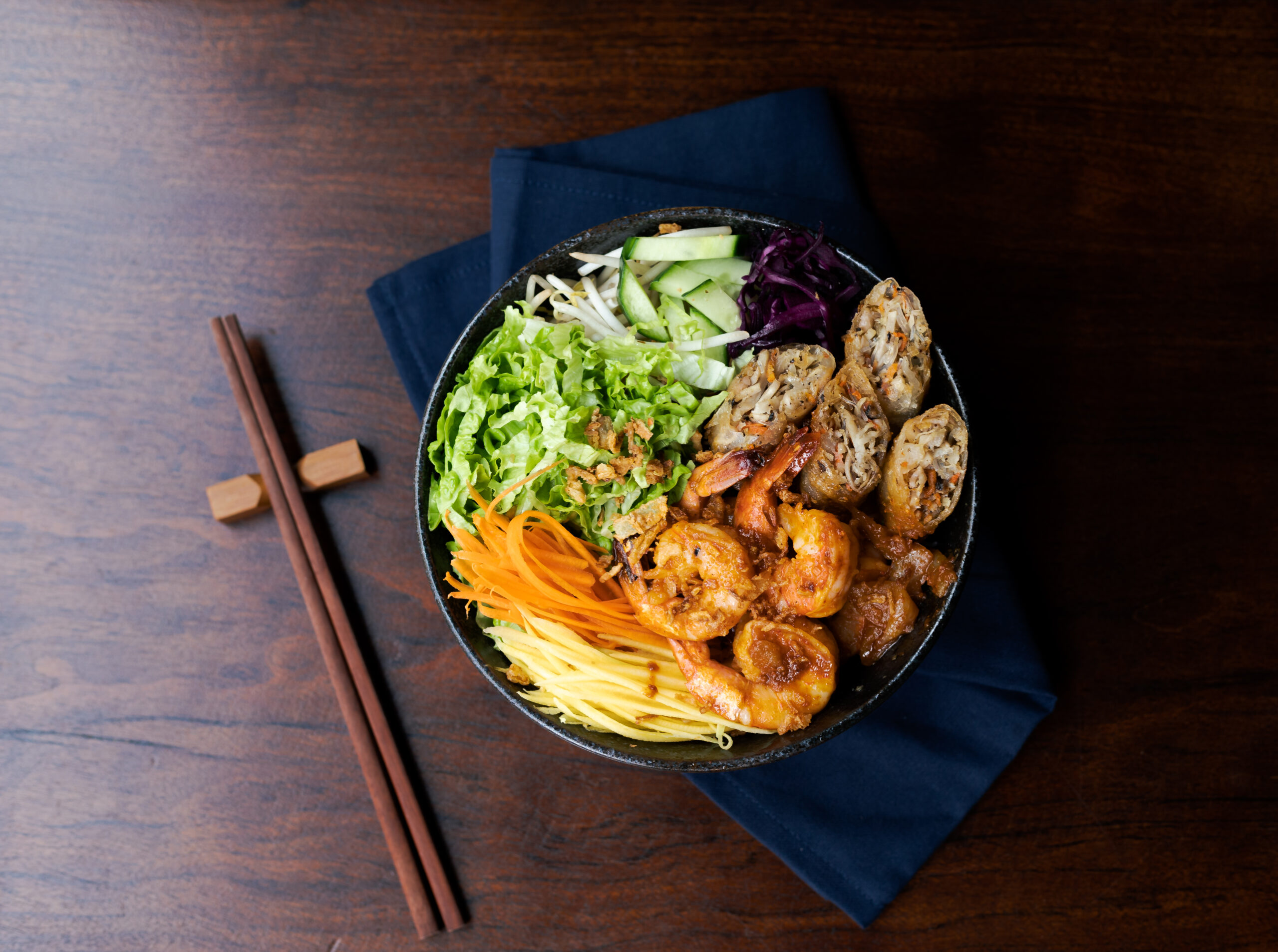 Vermicelles de riz. crudités, crevettes sauté, nem au porc / aux légumes, cacahuètes oignon frit