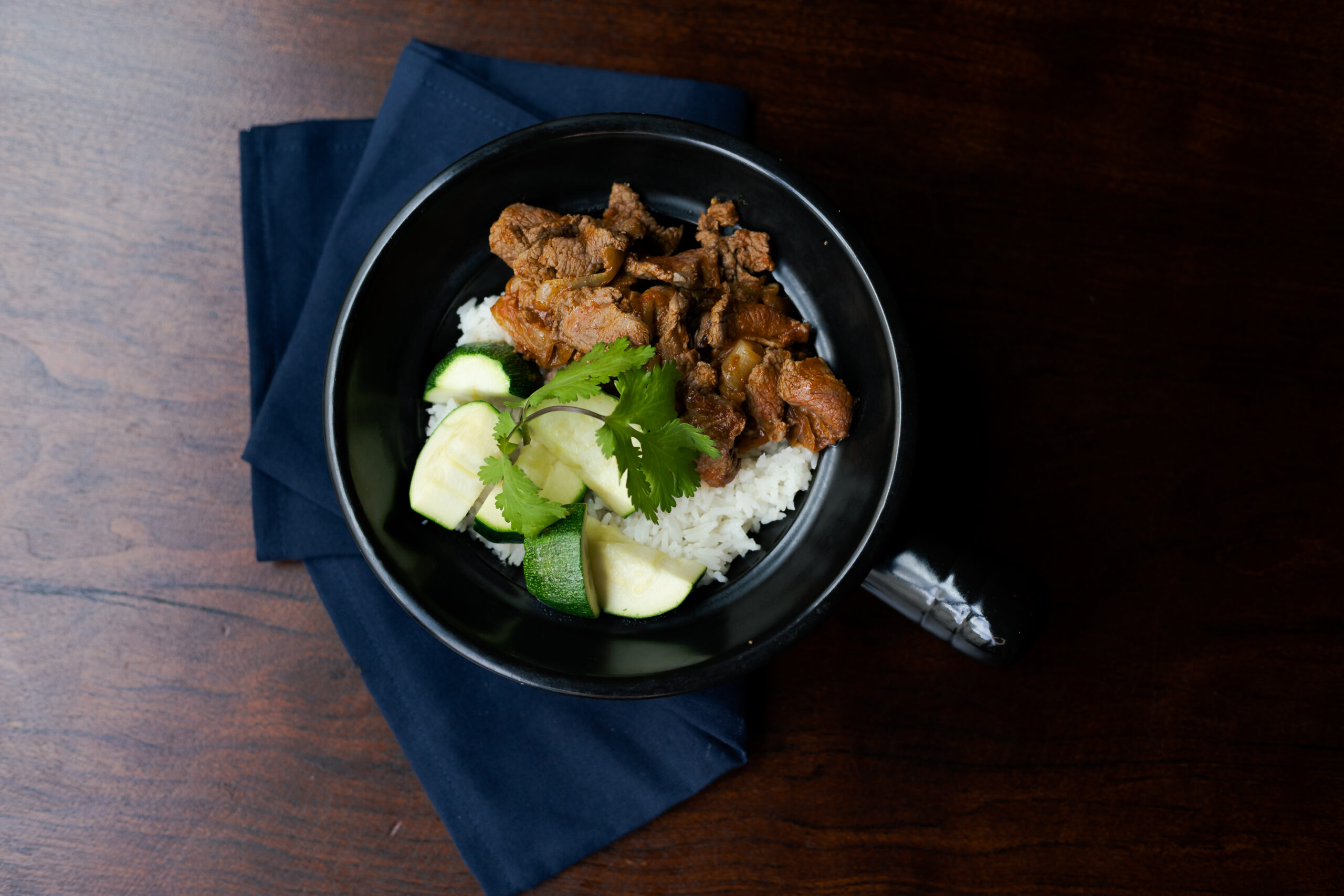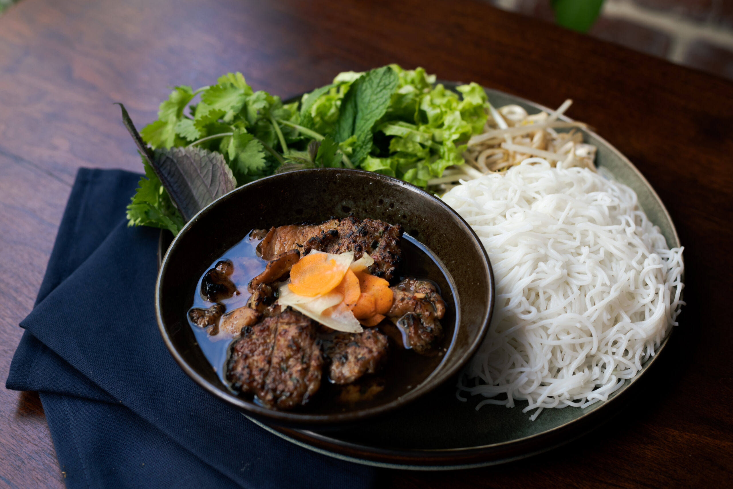 Porc grillé au charbon avec vermicelle de riz, crudité et herbes aromatiques