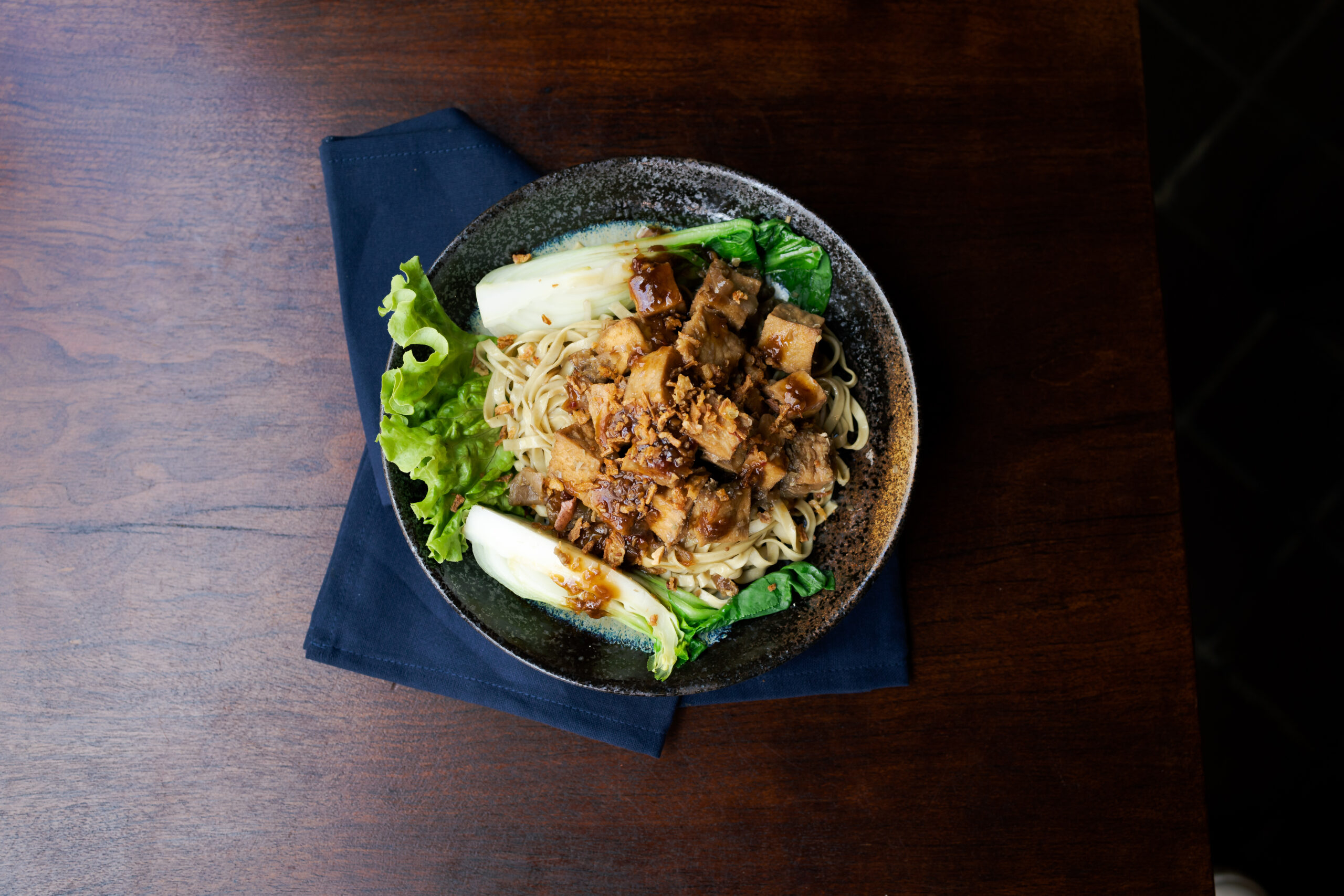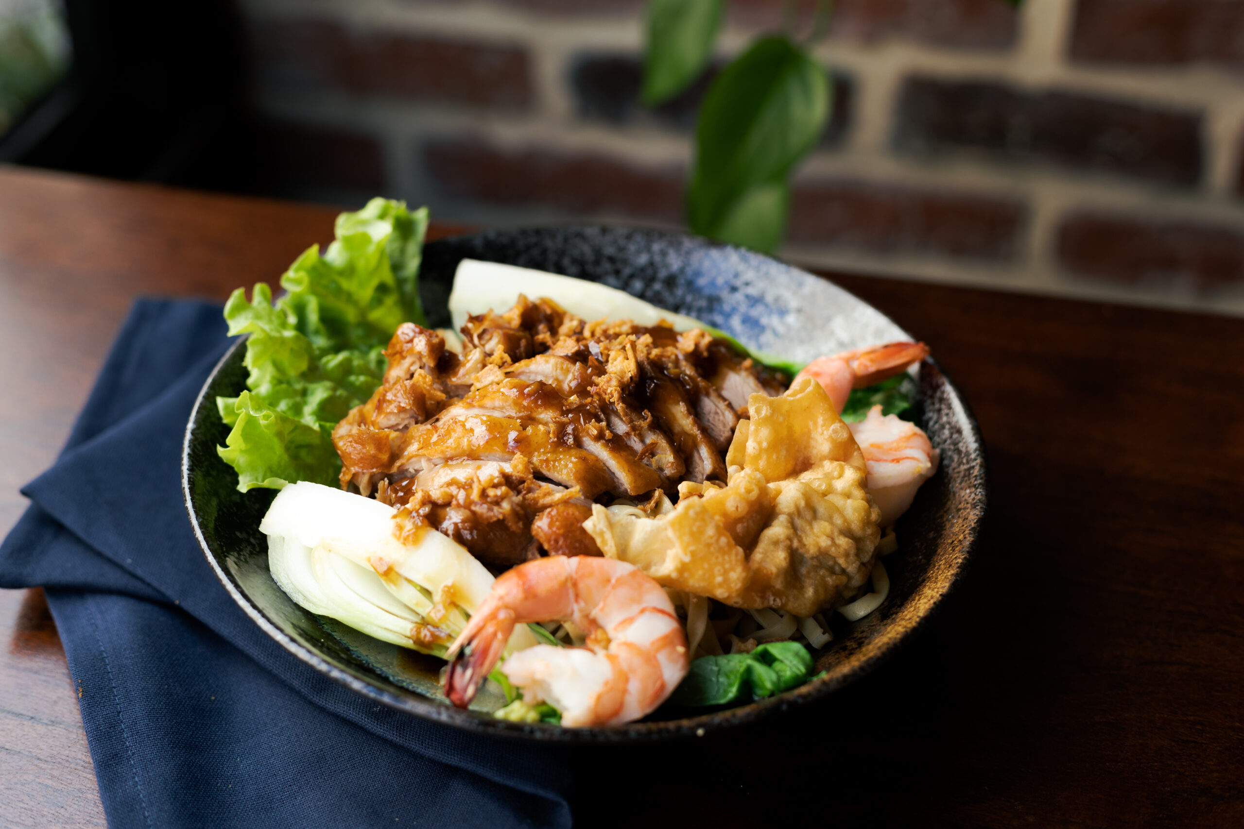 Nouilles sèches avec canard rôti, ravioli au porc, oeuf dure mariné à la sauce soja, légumes, sauce maison