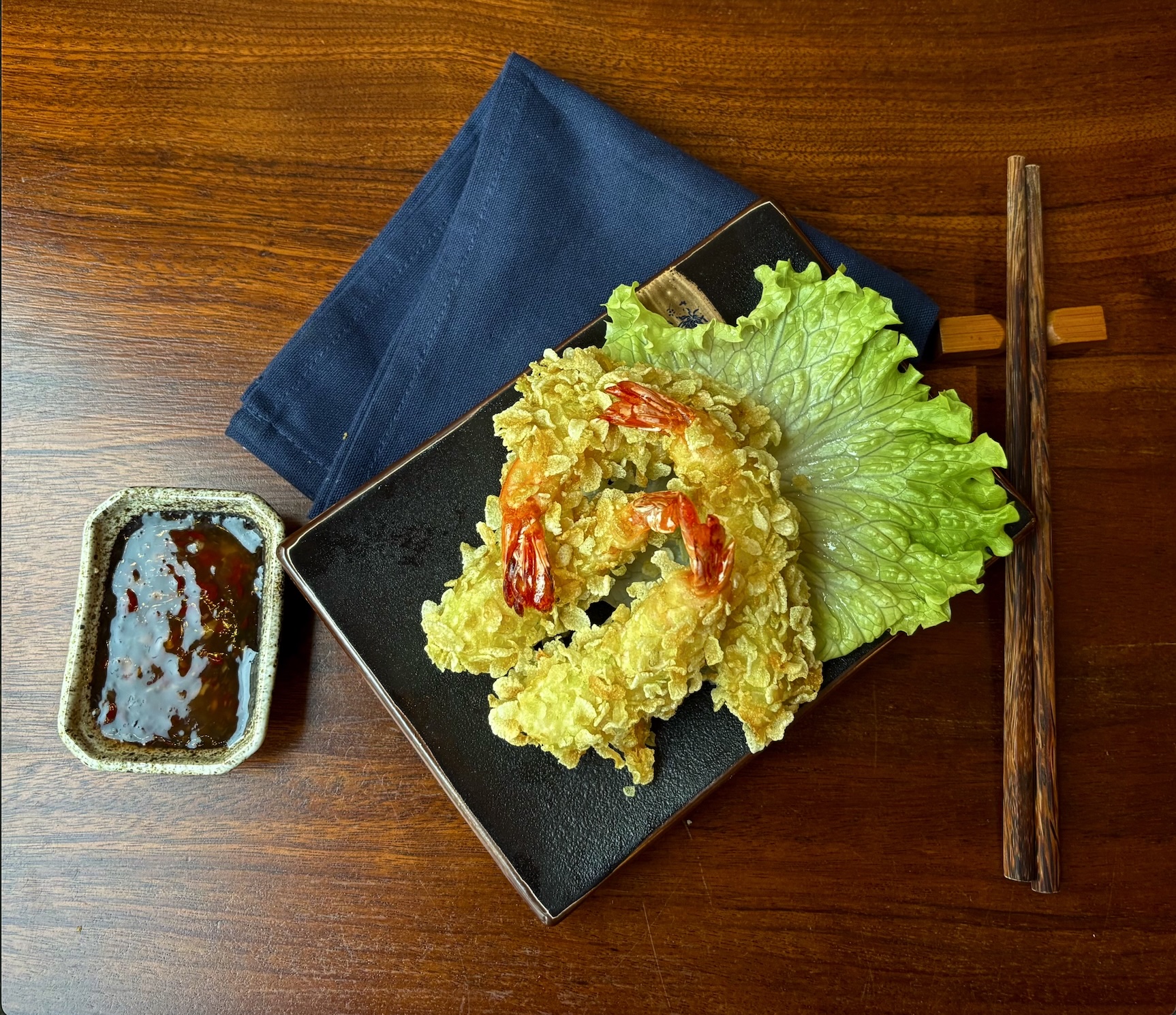 2 nems, 2 beignets de crevette croustillant au riz vert, 2 raviolis frits, 1 Rouleau de printemps